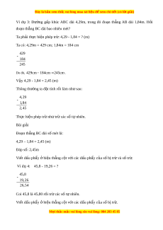 ậ 4,29 - 1,84 = 2,45 (m) Thông thư ng t ờ a đ t ặ tính r i ồ làm nh s ư au: 4,29 1,84 2,45 Th c hi ự n phép t ệ r nh ừ t ư rừ các số t nhi ự ên. Bài gi i ả Đo n ạ th ng B ẳ C dài s m ố ét là: 4,29 – 1,84 = 2,45 (m) Đáp số: 2,45m Vi t ế dấu phẩy ở hi u t ệ h ng ẳ c t ộ v i ớ các d u ph ấ y c ẩ a ủ s b ố t ị r và ừ s t ố r . ừ Ví d 4: ụ 45,8 - 19,26 = ? 45,8 19,26 26,54