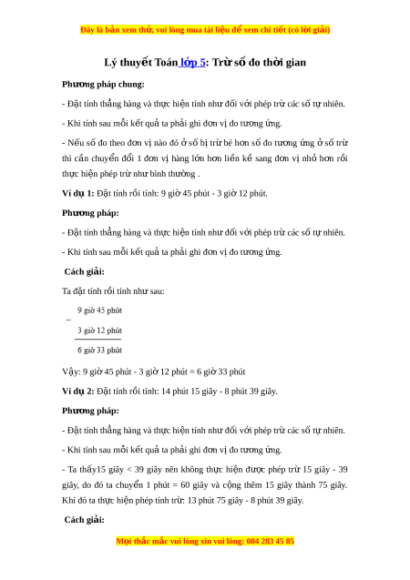 - Đặt tính thẳng hàng và th c ự hi n ệ tính nh ư đ i ố v i ớ phép trừ các s ố t ự nhiên. - Khi tính sau m i ỗ k t ế qu ả ta ph i ả ghi đ n ơ v ịđo tư ng ơ ng. ứ Cách gi i: ả Ta đặt tính r i ồ tính nh ư sau: Vậy: 9 gi ờ 45 phút - 3 gi ờ 12 phút = 6 gi ờ 33 phút