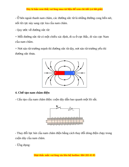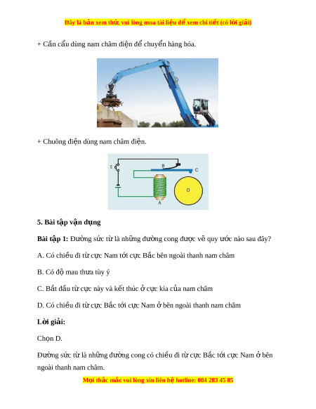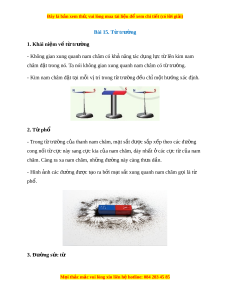 + Cần cẩu dùng nam châm đi n đ ệ ể chuy n hàng hóa. ể + Chuông đi n dùng nam ệ châm đi n. ệ 5. Bài tập v n d ậ ng ụ Bài tập 1: Đư ng ờ s c ứ t l ừ à nh ng đ ữ ư ng cong ờ đư c v ợ quy ẽ ư c ớ nào sau đây? A. Có chi u đi ề t c ừ c ự Nam t i ớ c c B ự c bên ắ ngoài thanh nam châm B. Có đ m ộ au th a ư tùy ý C. B t ắ đ u t ầ c ừ c ự này và k t ế thúc c ở c ki ự a c a ủ nam châm D. Có chi u đi ề t c ừ c ự B c ắ t i ớ c c N ự am bên ngoài ở thanh nam châm L i ờ giải: Ch n ọ D. Đư ng ờ s c ứ t l ừ à nh ng đ ữ ư ng cong ờ có chi u đi ề t c ừ c B ự c ắ t i ớ c c N ự am bên ở ngoài thanh nam châm. M i