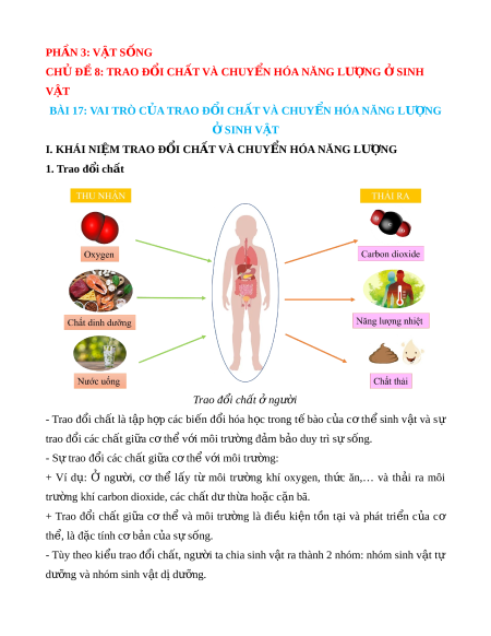 PHẦN 3: VẬT S N Ố G CH Đ Ủ Ề 8: TRAO Đ I Ổ CHẤT VÀ CHUY N Ể HÓA NĂNG LƯ N Ợ G SI Ở NH VẬT BÀI 17: VAI TRÒ C A Ủ TRAO Đ I Ổ CH T Ấ VÀ CHUY N Ể HÓA NĂNG LƯ N Ợ G Ở SINH VẬT I. KHÁI NI M Ệ TRAO Đ I Ổ CH T Ấ VÀ CHUY N Ể HÓA NĂNG LƯ N Ợ G 1. Trao đ i ổ ch t ấ Trao đổi ch t ấ ở ngư i ờ - Trao đ i ổ ch t ấ là t p ậ h p ợ các bi n ế đ i ổ hóa h c ọ trong t ế bào c a ủ c ơ th ể sinh v t ậ và sự trao đổi các ch t ấ gi a c ữ ơ thể v i ớ môi trư ng ờ đ m ả b o duy t ả rì s s ự ng. ố - S t ự rao đ i ổ các ch t ấ gi a ữ c t ơ h v ể i ớ môi trư ng: ờ + Ví d : ụ Ở ngư i ờ , cơ thể l y ấ từ môi trư ng ờ khí oxygen, th c ứ ăn,… và th i ả ra môi trư ng khí ờ carbon dioxide, các ch t ấ dư th a ừ ho c c ặ n bã. ặ + Trao đ i ổ ch t ấ gi a ữ cơ thể và môi trư ng ờ là đi u ề ki n ệ t n ồ t i ạ và phát tri n ể c a ủ cơ th , l ể à đặc tính c b ơ n ả c a s ủ s ự ng. ố - Tùy theo ki u t ể rao đ i ổ ch t ấ , ngư i ờ ta chia sinh v t