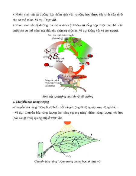 ậ ra thành 2 nhóm: nhóm sinh v t ậ tự dư ng ỡ và nhóm sinh v t ậ d d ị ư ng. ỡ + Nhóm sinh v t ậ tự dư ng: ỡ Là nhóm sinh v t ậ tự t ng ổ h p ợ đư c ợ các ch t ấ c n ầ thi t ế cho cơ th m ể ình. Ví d : ụ Th c ự v t ậ . + Nhóm sinh v t ậ dị dư ng: ỡ Là nhóm sinh v t ậ không tự t ng ổ h p ợ đư c ợ các ch t ấ c n ầ thi t ế cho cơ th m ể ình mà ph i ả thu nh n ậ t t ừ h c ăn. ứ Ví d : ụ Đ ng v ộ t ậ và con ngư i ờ . Sinh v t ậ t d ự ư ng ỡ và sinh v t ậ d d ị ư ng ỡ 2. Chuy n hóa nă ể ng lư ng ợ - Chuy n hóa ể năng lư ng l ợ à sự bi n đ ế i ổ năng lư ng t ợ d ừ ng ạ này sang d ng ạ khác. - Ví d : ụ Chuy n ể hóa năng lư ng