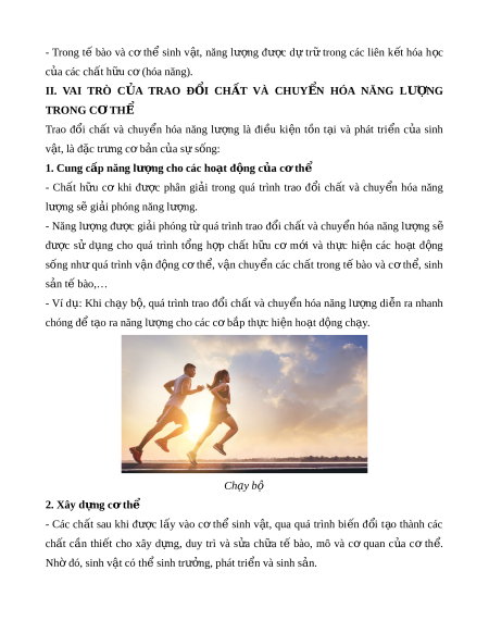 ả trong quá trình trao đ i ổ ch t ấ và chuy n ể hóa năng lư ng ợ s gi ẽ i ả phóng năng lư ng. ợ - Năng lư ng ợ đư c ợ gi i ả phóng t ừ quá trình trao đ i ổ ch t ấ và chuy n ể hóa năng lư ng ợ sẽ đư c ợ sử d ng ụ cho quá trình t ng ổ h p ợ ch t ấ h u ữ cơ m i ớ và th c ự hi n ệ các ho t ạ đ ng ộ sống như quá trình v n ậ đ ng ộ c t ơ h , ể v n ậ chuy n ể các ch t ấ trong t bào ế và c ơ th , ể sinh s n t ả bào,… ế - Ví d : ụ Khi ch y ạ b , ộ quá trình trao đ i ổ ch t ấ và chuy n ể hóa năng lư ng ợ di n ễ ra nhanh chóng để t o r ạ a năng lư ng cho các ợ c b ơ p ắ th c hi ự n ho ệ t ạ đ ng ộ ch y ạ . Ch y ạ bộ 2. Xây dựng c t ơ h ể - Các ch t ấ sau khi đư c ợ l y ấ vào c ơ th ể sinh v t ậ , qua quá trình bi n ế đ i ổ t o ạ thành các chất c n ầ thi t ế cho xây d ng, ự duy trì và s a ử ch a