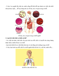 ữ tế bào, mô và cơ quan c a ủ cơ th . ể Nhờ đó, sinh v t ậ có th s ể inh trư ng, phát ở tri n và s ể inh s n. ả - Ví d : ụ Con ngư i ờ l y ấ th c ứ ăn, nư c ớ u ng ố đ ể bi n ế đ i ổ t o ạ thành các ch t ấ c n ầ thi t ế nh pr ư otein, lipid,… đ xây d ể ng nên các ự t bào, m ế ô, c quan t ơ rong c t ơ h . ể T bào, m ế ô, c quan t ơ rong cơ th ng ể ư i ờ