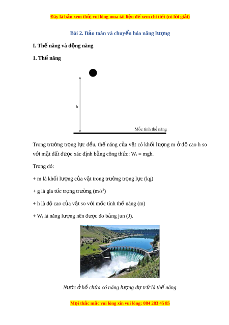 Bài 2. Bảo toàn và chuy n hóa năng l ể ư ng ợ I. Th năng và đ ế ng năng ộ 1. Thế năng Trong trư ng ờ tr ng ọ l c ự đ u, ề thế năng c a ủ v t ậ có kh i ố lư ng ợ m ở đ ộ cao h so v i ớ m t ặ đ t ấ đư c ợ xác đ nh b ị ng công t ằ h c ứ : Wt = mgh. Trong đó: + m là kh i ố lư ng ợ c a v ủ t ậ trong trư ng t ờ r ng ọ l c ự (kg) + g là gia tốc tr ng t ọ rư ng ờ (m/s2) + h là đ cao c ộ a ủ v t ậ so v i ớ m c t ố ính th năng ế (m) + Wt là năng lư ng nên đ ợ ược đo b ng ằ jun (J). Nư c ớ h
