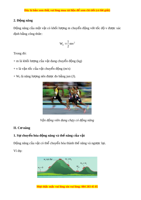 Đây là bản xem th , vu ử i lòng mua tài li u ệ đ xe ể m chi ti t (c ế ó l i ờ gi i ả ) 2. Đ ng ộ năng Đ ng ộ năng c a ủ m t ộ v t ậ có khối lư ng ợ m chuy n ể đ ng ộ v i ớ t c ố độ v đư c ợ xác định b ng ằ công th c: ứ 1 2 W mv d 2 Trong đó: + m là kh i ố lư ng c ợ a ủ v t ậ đang chuy n ể đ ng ộ (kg) + v là v n ậ tốc c a v ủ t ậ chuy n ể đ ng ộ (m/s) + Wđ là năng lư ng ợ nên đư c ợ đo b ng j ằ un (J). V n đ ậ ng vi ộ