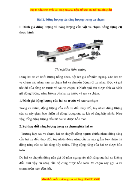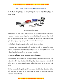 Đây là bản xem th , vu ử i lòng mua tài li u ệ đ xe ể m chi ti t ế (có l i ờ gi i ả ) Bài 2. Đ ng l ộ ư ng và năng l ợ ư ng t ợ rong va ch m ạ I. Đánh giá đ ng ộ lư ng ợ và năng lư ng ợ c a ủ v t ậ va ch m ạ b ng ằ d ng ụ cụ thực hành Thí nghi m ệ ki m ể ch ng ứ Dùng hai xe có kh i ố lư ng ợ b ng ằ nhau, đ t ặ lên giá đỡ n m ằ ngang. Cho hai xe va ch m ạ vào nhau, sau va ch m ạ hai xe chuy n ể đ ng ộ r i ờ xa nhau. Đ c ọ và ghi tốc độ c a ủ t ng ừ xe trư c ớ và sau va ch m ạ . Từ k t ế quả thu đư c ợ tính và đánh giá đ ng l ộ ư ng, năng ợ lư ng c ợ a hai ủ xe trư c ớ và sau va ch m ạ . 1. Đánh giá đ ng ộ lư ng c ợ a hai ủ xe trư c và s ớ au va ch m ạ Trong va ch m ạ , đ ng ộ lư ng ợ c a ủ m i ỗ xe đ u ề thay đ i ổ , tuy nhiên đ ng ộ lư ng ợ c a ủ xe này gi m ả bao nhiêu thì đ ng ộ lư ng ợ c a ủ xe kia s ẽ tăng b y ấ nhiêu. Như v y ậ , tổng đ ng l ộ ư ng c ợ a ủ hệ hai xe đư c ợ b o t ả oàn. 2. Sự thay đ i ổ năng lư ng ợ trong va ch m ạ gi a h ữ ai xe - Trư ng ờ h p ợ sau va ch m ạ , hai xe chuy n ể đ ng ộ ngư c ợ chi u ề nhau: đ ng ộ năng c a ủ hai xe đ u ề thay đ i ổ , tuy nhiên đ ng ộ năng c a ủ xe này gi m ả bao nhiêu thì đ ng ộ năng c a ủ xe kia tăng b y ấ nhiêu. T ng ổ đ ng ộ năng c a ủ hai xe đư c ợ b o ả toàn. Do hai xe chuy n ể đ ng ộ trên giá đ ỡ n m ằ ngang nên th ế năng c a ủ hai xe không đổi, như v y ậ cơ năng c a ủ hệ cũng đư c ợ b o ả toàn. Va ch m ạ này g i ọ là va ch m