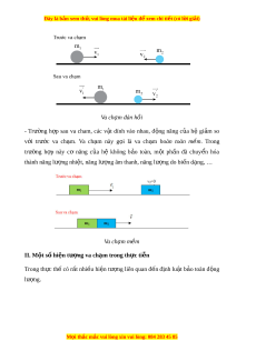 Đây là bản xem th , vu ử i lòng mua tài li u ệ đ xe ể m chi ti t (c ế ó l i ờ gi i ả ) Va chạm đàn hồi - Trư ng ờ h p ợ sau va cham, các v t ậ dính vào nhau, đ ng ộ năng c a ủ hệ gi m ả so v i ớ trước va ch m ạ . Va ch m ạ này g i ọ là va ch m ạ hoàn toàn m m ề . Trong trư ng ờ h p ợ này cơ năng c a ủ hệ không b o ả toàn, m t ộ ph n ầ đã chuy n ể hóa thành năng lư ng nhi ợ t ệ , năng lư ng âm ợ thanh, năng lư ng ợ do bi n d ế ng, … ạ Va chạm m m ề II. M t ộ s hi ố n t ệ ư ng va ch ợ m ạ trong th c t ự i n ễ Trong th c ự th có ế r t ấ nhi u hi ề n ệ tư ng l ợ iên quan đ n đ ế nh l ị u t ậ b o ả toàn đ ng ộ lư ng. ợ M i ọ thắc m c