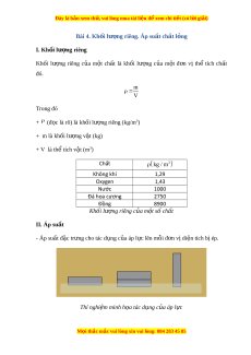 Đây là bản xem th , vu ử i lòng mua tài li u ệ đ xe ể m chi ti t ế (có l i ờ gi i ả ) Bài 4. Kh i ố lư ng ợ riêng. Áp su t ấ ch t ấ l ng ỏ I. Kh i ố lư ng ri ợ êng Kh i ố lư ng ợ riêng c a ủ m t ộ ch t ấ là kh i ố lư ng ợ c a ủ m t ộ đ n ơ vị thể tích ch t ấ đó. m V Trong đó + (đ c l ọ à rô) là kh i ố lư ng ợ riêng (kg/m3) + m là kh i ố lư ng ợ v t ậ (kg) + V là th t ể ích v t ậ (m3) Chất 3 kg / m Không khí 1,29 Oxygen 1,43 Nước 1000 Đá hoa cương 2750 Đồng 8900 Khối lư ng r ợ iêng c a m ủ t ộ s ch ố t ấ II. Áp su t ấ - Áp suất đ c t ặ r ng cho t ư ác d ng ụ c a áp l ủ c l ự ên m i ỗ đ n v ơ di ị n t ệ ích b ép. ị Thí nghi m ệ minh h a ọ tác d ng c ụ a áp l ủ c ự M i