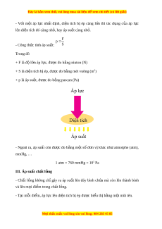lên diện tích đó càng nh , ỏ hay áp su t ấ càng nh . ỏ F p - Công th c ứ tính áp su t ấ : S Trong đó + F là đ l ộ n ớ áp l c, đ ự ư c ợ đo b ng ni ằ uton (N) + S là di n t ệ ích b ép, đ ị ư c đo b ợ ng ằ mét vuông (m2) + p là áp su t ấ , đư c đo b ợ ng ằ pascan (Pa) - Ngoài ra, áp su t ấ còn đư c ợ đo b ng ằ m t ộ s ố đ n ơ v ịkhác nh ư atmotphe (atm), mmHg, … 1 atm = 760 mmHg = 105 Pa III. Áp su t ấ ch t ấ l ng ỏ - Ch t ấ l ng