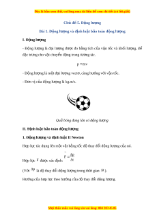 Đây là bản xem th , vu ử i lòng mua tài li u ệ đ xe ể m chi ti t ế (có l i ờ gi i ả ) Chủ đ 5. Đ ề ng l ộ ư ng ợ Bài 1. Đ ng l ộ ư ng và đ ợ nh l ị u t ậ b o t ả oàn đ ng l ộ ư ng ợ I. Đ ng ộ lư ng ợ - Đ ng ộ lư ng ợ là đ i ạ lư ng ợ đư c ợ đo b ng ằ tích c a ủ v n ậ t c ố và kh i ố lư ng, ợ để đ c t ặ r ng cho v ư t ậ chuy n đ ể ng t ộ rong tư ng t ơ ác. p m v - Đ ng ộ lư ng l ợ à m t ộ đ i ạ lư ng vect ợ , cùng ơ hư ng v ớ i ớ v n ậ t c. ố - Đ n ơ v c ị a ủ đ ng l ộ ư ng ợ là kg.m/s.