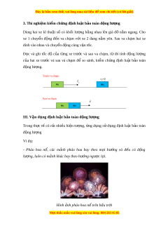 Đây là bản xem th , vu ử i lòng mua tài li u ệ đ xe ể m chi ti t ế (có l i ờ gi i ả ) 3. Thí nghi m ệ ki m ể ch ng đ ứ n ị h lu t ậ b o t ả oàn đ ng ộ lư ng ợ Dùng hai xe kĩ thu t ậ số có kh i ố lư ng ợ b ng ằ nhau lên giá đỡ n m ằ ngang. Cho xe 1 chuy n ể đ ng ộ đ n ế va ch m ạ v i ớ xe 2 đang n m ằ yên. Sau va ch m ạ hai xe dính vào nhau và chuy n ể đ ng cùng v ộ n t ậ ốc. Đ c ọ và ghi t c ố độ c a ủ t ng ừ xe trư c ớ và sau va ch m ạ , từ đó tính đ ng ộ lư ng ợ c a ủ hai xe trư c ớ và sau và ch m ạ để so sánh, ki m ể ch ng ứ đ nh ị lu t ậ b o ả toàn đ ng l ộ ư ng. ợ III. V n d ậ ng đ ụ nh l ị u t ậ b o t ả oàn đ ng l ộ ư ng ợ Trong th c ự tế có r t ấ nhi u ề hi n ệ tư ng, ợ ng ứ d ng ụ s ử d ng ụ đ nh ị lu t ậ b o ả toàn đ ng l ộ ư ng ợ Ví d : ụ - Pháo hoa n , ổ các m nh