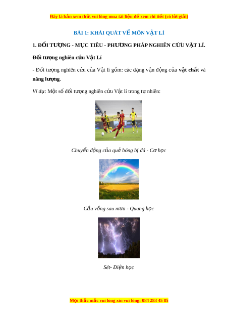 BÀI 1: KHÁI QUÁT V MÔ Ề N V T Ậ LÍ 1. Đ I Ố TƯỢNG - M C Ụ TIÊU - PHƯ N Ơ G PHÁP NGHIÊN C U Ứ V T Ậ LÍ. Đ i ố tư ng ng ợ hiên c u ứ V t ậ Lí - Đối tư ng ợ nghiên c u ứ c a ủ V t ậ lí g m ồ : các d ng ạ v n ậ đ ng ộ c a ủ vật ch t ấ và năng lư ng ợ . Ví dụ: M t ộ số đối tư ng nghi ợ ên c u ứ V t ậ lí trong t nhi ự ên: Chuy n ể đ ng c ộ a qu ủ ả bóng b đá - ị Cơ h c ọ Cầu vồng sau m a ư - Quang h c ọ Sét- Đi n h ệ c ọ M i