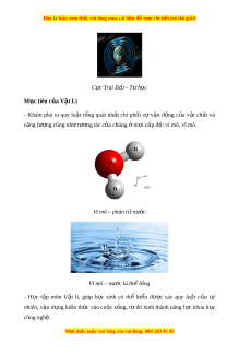 Cực Trái Đất - T h ừ c ọ Mục tiêu c a ủ V t ậ Lí - Khám phá ra quy lu t ậ t ng ổ quát nh t ấ chi ph i ố sự v n ậ đ ng ộ c a ủ v t ậ ch t ấ và năng lư ng ợ cũng nh t ư ư ng t ơ ác c a chúng ủ ở m i ọ c p đ ấ : ộ vi mô, vĩ mô. Vi mô – phân t n ử ư c ớ Vĩ mô – nư c ớ là th l ể ng ỏ - H c ọ t p ậ môn V t ậ lí, giúp h c ọ sinh có thể hi u ể đư c ợ các quy lu t ậ c a ủ tự nhiên, v n ậ d ng ụ ki n ế th c ứ vào cu c ộ s ng, ố t