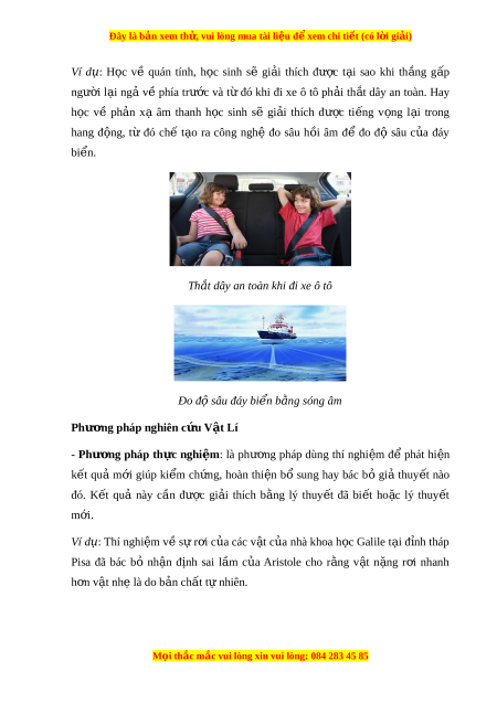 ắ dây an toàn khi đi xe ô tô Đo đ s ộ âu đáy bi n b ể ng s ằ óng âm Phư ng pháp n ơ ghiên c u ứ V t ậ Lí - Phư ng ơ pháp th c ự nghi m ệ : là phư ng ơ pháp dùng thí nghi m ệ để phát hi n ệ k t ế quả m i ớ giúp ki m ể ch ng, ứ hoàn thi n ệ bổ sung hay bác b ỏ gi ả thuy t ế nào đó. K t ế quả này c n ầ đư c ợ gi i ả thích b ng ằ lý thuy t ế đã bi t ế ho c ặ lý thuy t ế m i ớ . Ví dụ: Thí nghi m ệ v s ề ự r i ơ c a ủ các v t ậ c a ủ nhà khoa h c ọ Galile t i ạ đ nh ỉ tháp Pisa đã bác bỏ nh n ậ đ nh ị sai l m ầ c a ủ Aristole cho r ng ằ v t ậ n ng ặ r i ơ nhanh h n v ơ t ậ nhẹ là do b n ả chất t nhi ự ên. M i