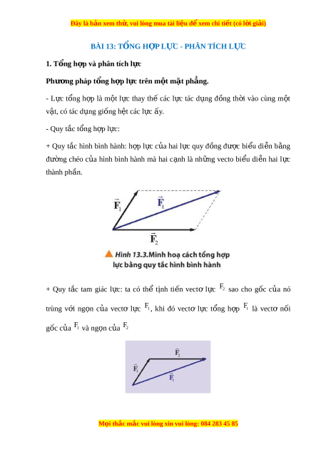 Đây là bản xem th , vu ử i lòng mua tài li u ệ đ xe ể m chi ti t ế (có l i ờ gi i ả ) BÀI 13: T N Ổ G H P Ợ L C Ự - PHÂN TÍCH L C Ự 1. T ng h ổ p và phân t ợ ích l c ự Phư ng pháp t ơ ng h ổ p ợ l c t ự rên m t ộ m t ặ ph ng. ẳ - L c ự t ng ổ h p ợ là m t ộ l c ự thay thế các l c ự tác d ng ụ đ ng ồ th i ờ vào cùng m t ộ v t ậ , có tác d ng gi ụ ống hệt các l c ự y ấ . - Quy tắc tổng h p l ợ c: ự + Quy t c ắ hình bình hành: h p ợ l c ự c a ủ hai l c ự quy đ ng ồ đư c ợ bi u ể di n ễ b ng ằ đư ng ờ chéo c a