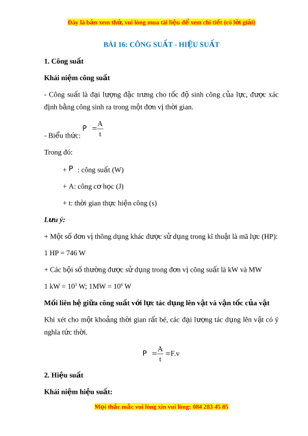 Đây là bản xem th , vu ử i lòng mua tài li u ệ đ xe ể m chi ti t ế (có l i ờ gi i ả ) BÀI 16: CÔNG SU T Ấ - HI U Ệ SU T Ấ 1. Công su t ấ Khái ni m ệ công su t ấ - Công su t ấ là đ i ạ lư ng ợ đ c ặ tr ng ư cho t c ố độ sinh công c a ủ l c, ự đư c ợ xác định b ng công s ằ inh ra trong m t ộ đ n v ơ t ị h i ờ gian. A P - Bi u ể th c: ứ t Trong đó: + P : công suất (W) + A: công c h ơ c ọ (J) + t: th i ờ gian th c hi ự n công ( ệ s) Lưu ý: + M t ộ số đ n v ơ ị thông d ng ụ khác đư c ợ s d ử ng t ụ rong kĩ thu t ậ là mã l c ự (HP): 1 HP = 746 W + Các b i ộ số thư ng đ ờ ư c ợ s d ử ng ụ trong đ n v ơ công s ị u t ấ là kW và MW 1 kW = 103 W; 1MW = 106 W M i ố liên h gi ệ a công s ữ u t ấ v i ớ l c ự tác d ng l ụ ên v t ậ và v n t ậ c c ố a v ủ t ậ Khi xét cho m t ộ kho ng ả th i ờ gian r t ấ bé, các đ i ạ lư ng ợ tác d ng ụ lên v t ậ có ý nghĩa t c t ứ h i ờ . A P F .v t 2. Hi u s ệ u t ấ Khái ni m ệ hi u s ệ u t ấ : M i