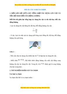 ằ tốc độ thay đổi đ ng ộ lư ng c ợ a v ủ t ậ . p F t - Ví dụ: L c ự do m t ặ v t ợ tác d ng ụ quả bóng tenis b ng ằ t c ố độ thay đ i ổ đ ng ộ lư ng c ợ a ủ qu bóng. ả Lưu ý : - N u ế v t ậ chịu tác d ng c ụ a ủ nhi u l ề c t ự hì F là h p ợ l c t ự ác d ng l ụ ên v t ậ . - Bi u ể th c ứ p F . t : Độ bi n ế thiên đ ng ộ lư ng ợ c a ủ m t ộ v t ậ b ng ằ xung lư ng ợ c a ủ l c ự tác d ng ụ lên v t ậ . Trong đó, tích F. t đư c ợ g i ọ là xung lư ng ợ c a l ủ c ự (xung l c) ự . 2. THÍ NGHI M K Ệ HẢO SÁT VA CH M Ạ Các loại va chạm Va ch m ạ đàn hồi và va ch m ạ m m ề : M i