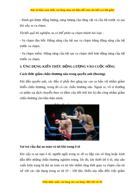 ệ , ta có th phân va ể ch m ạ thành hai lo i ạ : - Va ch m ạ đàn h i ồ : Đ ng ộ năng c a ủ hệ sau va ch m ạ b ng ằ đ ng ộ năng c a ủ hệ trư c ớ va ch m ạ . - Va ch m ạ m m ề : Đ ng ộ năng c a ủ hệ sau va ch m ạ nhỏ h n ơ đ ng ộ năng c a ủ hệ trư c ớ va ch m ạ . 3. N Ứ G D N Ụ G KI N Ế TH C Ứ Đ N Ộ G LƯ N Ợ G VÀO CU C Ộ S N Ố G Cách th c gi ứ m ả ch n t ấ hư ng não t ơ rong quy n anh ( ề Boxing). Khi đ u ấ quy n ề anh, các đ u ấ sĩ ph i ả đeo găng tay cao su b o ả vệ nh m ằ gi m ả thi u ể ch n ấ thư ng, ơ trong đó có các ch n ấ thư ng