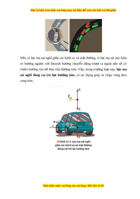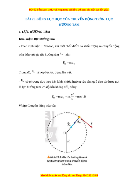 Đây là bản xem th , vu ử i lòng mua tài li u ệ đ xe ể m chi ti t ế (có l i ờ gi i ả ) BÀI 21. Đ N Ộ G L C Ự H C Ọ C A Ủ CHUY N Ể Đ N Ộ G TRÒN. L C Ự HƯ N Ớ G TÂM 1. L C Ự HƯ N Ớ G TÂM Khái ni m ệ l c h ự ư ng ớ tâm - Theo đ nh ị lu t ậ II Newton, khi m t ộ ch t ấ đi m ể có kh i ố lư ng ợ m chuy n ể đ ng ộ