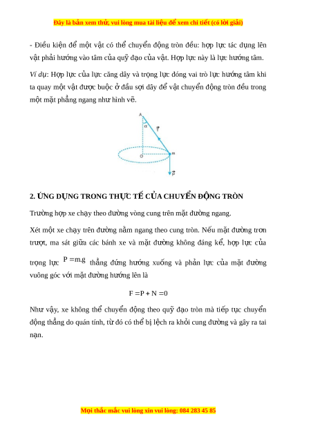 Đây là bản xem th , vu ử i lòng mua tài li u ệ đ xe ể m chi ti t (c ế ó l i ờ gi i ả ) - Đi u ề ki n ệ để m t ộ v t ậ có thể chuy n ể đ ng ộ tròn đ u: ề h p ợ l c ự tác d ng ụ lên v t ậ ph i ả hư ng ớ vào tâm c a qu ủ đ ỹ o ạ c a v ủ t ậ . H p l ợ c này l ự à l c h ự ư ng t ớ âm. Ví dụ: H p ợ l c ự c a ủ l c ự căng dây và tr ng ọ l c ự đóng vai trò l c ự hư ng ớ tâm khi ta quay m t ộ v t ậ đư c ợ bu c ộ ở đ u ầ s i ợ dây đ ể v t ậ chuy n ể đ ng ộ tròn đ u ề trong m t ộ m t ặ ph ng ngang nh ẳ ư hình v . ẽ 2. N Ứ G D N Ụ G TRONG TH C Ự T C Ế A Ủ CHUY N Ể Đ N Ộ G TRÒN Trư ng h ờ p xe ch ợ y ạ theo đư ng vòng cung ờ trên m t ặ đư ng ngang. ờ Xét m t ộ xe ch y ạ trên đư ng ờ n m ằ ngang theo cung tròn. N u ế m t ặ đư ng ờ tr n ơ trư t ợ , ma sát gi a ữ các bánh xe và m t ặ đư ng ờ không đáng k , ể h p ợ l c ự c a ủ tr ng ọ l c ự P m .g th ng ẳ đ ng ứ hư ng ớ xu ng ố và ph n ả l c ự c a ủ m t ặ đư ng ờ vuông góc v i ớ m t ặ đư ng h ờ ư ng ớ lên là F P N 0 Như v y ậ , xe không thể chuy n ể đ ng ộ theo quỹ đ o ạ tròn mà ti p ế t c ụ chuy n ể đ ng ộ th ng ẳ do quán tính, t ừ đó có th ể b ịl ch ệ ra kh i ỏ cung đư ng ờ và gây ra tai n n. ạ M i ọ thắc m c