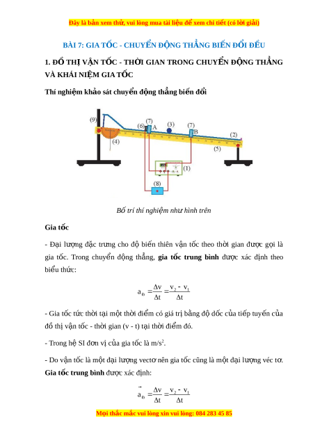 Đây là bản xem th , vu ử i lòng mua tài li u ệ đ xe ể m chi ti t ế (có l i ờ gi i ả ) BÀI 7: GIA T C Ố - CHUY N Ể Đ N Ộ G TH N Ẳ G BI N Ế Đ I Ổ Đ U Ề 1. ĐỒ THỊ V N Ậ T C Ố - TH I Ờ GIAN TRONG CHUY N Ể Đ N Ộ G TH N Ẳ G VÀ KHÁI NI M Ệ GIA T C Ố Thí nghi m ệ kh o s ả át chuy n đ ể ng ộ th ng b ẳ i n đ ế i ổ Bố trí thí nghi m ệ nh hì ư nh trên Gia t c ố - Đ i ạ lư ng ợ đ c ặ tr ng ư cho độ bi n ế thiên v n ậ t c ố theo th i ờ gian đư c ợ g i ọ là gia tốc. Trong chuy n ể đ ng ộ th ng, ẳ gia t c ố trung bình đư c ợ xác đ nh ị theo bi u t ể h c: ứ v v v 2 1 atb t t - Gia t c ố t c ứ th i ờ t i ạ m t ộ th i ờ đi m ể có giá tr ịb ng ằ đ d ộ c ố c a ủ ti p ế tuy n ế c a ủ đồ thị v n ậ tốc - th i ờ gian (v - t) t i ạ th i ờ đi m ể đó. - Trong hệ SI đ n ơ v c ị a ủ gia t c ố là m/s2. - Do v n ậ t c ố là m t ộ đ i ạ lư ng ợ vect nên ơ gia t c ố cũng là m t ộ đ i ạ lư ng ợ véc t . ơ Gia t c t