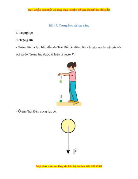 Đây là bản xem th , vu ử i lòng mua tài li u ệ đ xe ể m chi ti t (c ế ó l i ờ gi i ả ) Bài 17. Tr ng l ọ c và l ự c căng ự I. Tr ng ọ l c ự 1. Tr ng l ọ c ự - Tr ng ọ l c ự là l c ự h p ấ d n ẫ do Trái Đ t ấ tác d ng ụ lên v t ậ gây ra cho v t ậ gia t c ố