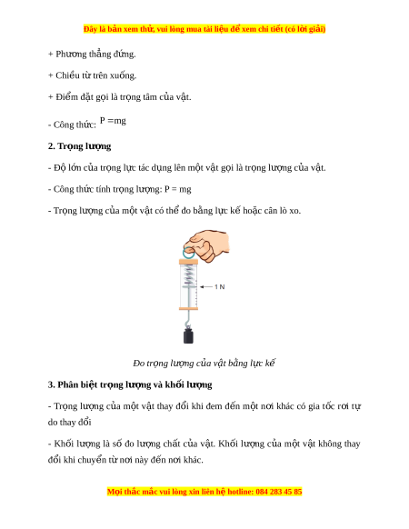 Đây là bản xem th , vu ử i lòng mua tài li u ệ đ xe ể m chi ti t (c ế ó l i ờ gi i ả ) + Phư ng t ơ h ng ẳ đ ng. ứ + Chi u ề t t ừ rên xu ng. ố + Đi m ể đ t ặ g i ọ là tr ng ọ tâm c a v ủ t ậ . - Công th c: ứ P m g 2. Tr ng l ọ ư ng ợ - Đ l ộ n c ớ a ủ tr ng ọ l c t ự ác d ng l ụ ên m t ộ v t ậ g i ọ là tr ng l ọ ư ng c ợ a ủ v t ậ . - Công th c ứ tính tr ng l ọ ư ng: ợ P = mg - Tr ng l ọ ư ng c ợ a ủ m t ộ v t ậ có th đo b ể ng ằ l c k ự ho ế c ặ cân lò xo. Đo tr ng l ọ ư ng c ợ a ủ v t ậ b ng ằ l c k ự ế 3. Phân bi t ệ tr ng l ọ ư ng và k ợ h i ố lư ng ợ - Tr ng ọ lư ng ợ c a ủ m t ộ v t ậ thay đ i ổ khi đem đ n ế m t ộ n i ơ khác có gia t c ố r i ơ tự do thay đổi - Kh i ố lư ng ợ là số đo lư ng ợ ch t ấ c a ủ v t ậ . Kh i ố lư ng ợ c a ủ m t ộ v t ậ không thay đổi khi chuy n t ể n ừ i ơ này đ n n ế i ơ khác. M i
