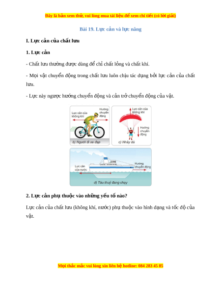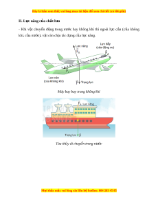 Đây là bản xem th , vu ử i lòng mua tài li u ệ đ xe ể m chi ti t (c ế ó l i ờ gi i ả ) Bài 19. L c c ự ản và l c ự nâng I. L c c ự ản c a ch ủ t ấ l u ư 1. Lực c n ả - Chất l u t ư hư ng đ ờ ư c ợ dùng đ ch ể ch ỉ t ấ l ng và ch ỏ t ấ khí. - M i ọ v t ậ chuy n ể đ ng ộ trong ch t ấ l u ư luôn ch u ị tác d ng ụ b i ở l c ự c n ả c a ủ ch t ấ l u. ư - L c này ng ự ư c h ợ ư ng ớ chuy n đ ể ng và ộ c n t ả r chuy ở n đ ể ng ộ c a v ủ t ậ . 2. Lực c n ph ả t ụ hu c ộ vào nh ng y ữ u t ế nào? ố L c ự c n ả c a ủ ch t ấ l u ư (không khí, nư c) ớ ph ụ thu c ộ vào hình d ng ạ và t c ố đ ộ c a ủ v t ậ . M i
