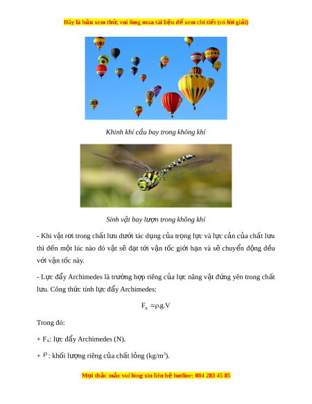 Đây là bản xem th , vu ử i lòng mua tài li u ệ đ xe ể m chi ti t (c ế ó l i ờ gi i ả ) Khinh khí c u bay t ầ rong không khí Sinh v t ậ bay lư n ợ trong không khí - Khi v t ậ r i ơ trong ch t ấ l u d ư ư i ớ tác d ng c ụ a ủ tr ng l ọ c ự và l c c ự n ả c a ch ủ t ấ l u ư thì đ n ế m t ộ lúc nào đó v t ậ sẽ đ t ạ t i ớ v n ậ t c ố gi i ớ h n ạ và sẽ chuy n ể đ ng ộ đ u ề v i ớ v n ậ t c này ố . - L c ự đ y ẩ Archimedes là trư ng ờ h p ợ riêng c a ủ l c ự nâng v t ậ đ ng ứ yên trong ch t ấ l u. C ư ông th c t ứ ính l c đ ự y ẩ Archimedes: F . g.V A Trong đó: + FA: l c đ ự y ẩ Archimedes (N). + : khối lư ng ợ riêng c a ủ ch t ấ l ng ( ỏ kg/m3). M i
