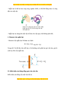 Đây là bản xem th , vu ử i lòng mua tài li u ệ đ xe ể m chi ti t (c ế ó l i ờ gi i ả ) - Ng u ẫ l c ự là hệ hai l c ự song song, ngư c ợ chi u, ề có độ l n ớ b ng ằ nhau và cùng đ t ặ vào m t ộ v t ậ . - Ng u l ẫ c t ự ác d ng l ụ ên m t ộ v t ậ ch l ỉ àm cho v t ậ quay ch không t ứ nh t ị i n. ế 2. Moment c a n ủ g u l ẫ c ự - Moment c a ủ ng u l ẫ c M ự đư c ợ xác đ nh: ị M F d F d 1 1 2 2 hay M = F.d Trong đó F là độ l n ớ c a ủ m i ỗ l c, ự d là kho ng ả cách gi a ữ hai giá c a ủ l c, ự g i ọ là cánh tay đòn c a ng ủ u l ẫ c. ự IV. Đi u ki ề n cân b ệ ng t ằ ng q ổ uát c a v ủ t ậ r n ắ Đi u ki ề n cân ệ b ng c ằ a ủ m t ộ v t ậ r n l ắ à: M i