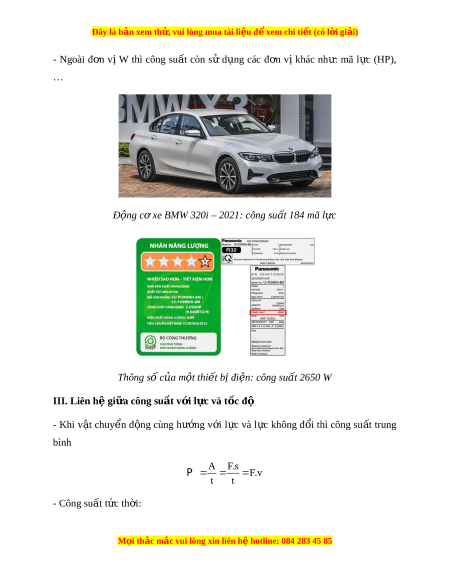 MW 320i – 2021: công su t ấ 184 mã l c ự Thông số c a m ủ t ộ thi t ế b đi ị n ệ : công su t ấ 2650 W III. Liên h gi ệ a công s ữ u t ấ v i ớ l c ự và t c đ ố ộ - Khi v t ậ chuy n ể đ ng ộ cùng hư ng ớ v i ớ l c ự và l c ự không đ i ổ thì công su t ấ trung bình A F.s P F .v t t - Công suất t c ứ th i ờ : M i