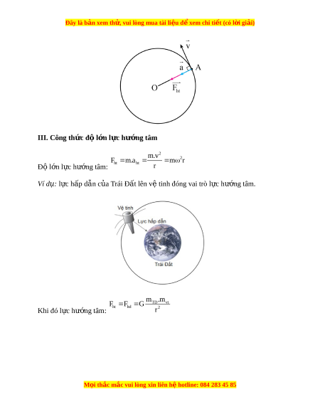 Đây là bản xem th , vu ử i lòng mua tài li u ệ đ xe ể m chi ti t (c ế ó l i ờ gi i ả ) III. Công th c đ ứ l ộ n l ớ c h ự ư ng t ớ âm 2 m.v 2 F m .a m r Độ l n l ớ c h ự ư ng t ớ âm: ht ht r Ví d : ụ l c ự h p d ấ n c ẫ a ủ Trái Đất lên v t ệ inh đóng vai trò l c ự hư ng t ớ âm. m .m TD vt F F G Khi đó l c ự hư ng t ớ âm: ht hd 2 r M i