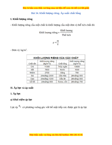 Đây là bản xem th , vu ử i lòng mua tài li u ệ đ xe ể m chi ti t (c ế ó l i ờ gi i ả ) Bài 34. Kh i ố lư ng ợ riêng. Áp su t ấ ch t ấ l ng ỏ I. Kh i ố lư ng ri ợ êng - Khối lư ng r ợ iêng c a m ủ t ộ ch t ấ là kh i ố lư ng c ợ a m ủ t ộ đ n v ơ t ị h t ể ích ch t ấ đó: m V - Đ n v ơ : ị kg/m3. II. Áp l c và áp s ự u t ấ 1. Áp l c ự a) Khái ni m ệ áp l c ự