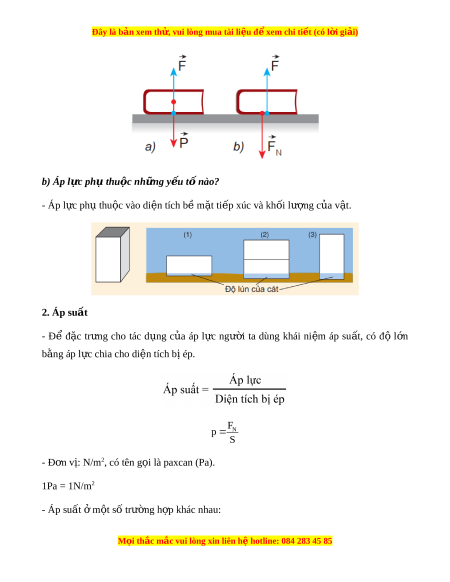 Đây là bản xem th , vu ử i lòng mua tài li u ệ đ xe ể m chi ti t (c ế ó l i ờ gi i ả ) b) Áp l c ph ự t ụ hu c ộ nh ng y ữ u t ế n ố ào? - Áp l c ph ự t ụ hu c ộ vào di n t ệ ích b m ề t ặ ti p xúc và kh ế i ố lư ng c ợ a ủ v t ậ . 2. Áp suất - Để đ c ặ tr ng ư cho tác d ng ụ c a ủ áp l c ự ngư i ờ ta dùng khái ni m ệ áp su t ấ , có đ ộ l n ớ b ng ằ áp l c chi ự a cho di n t ệ ích b ép. ị FN p S - Đ n v ơ : ị N/m2, có tên g i ọ là paxcan (Pa). 1Pa = 1N/m2 - Áp suất m ở t ộ số trư ng ờ h p khác nhau: ợ M i