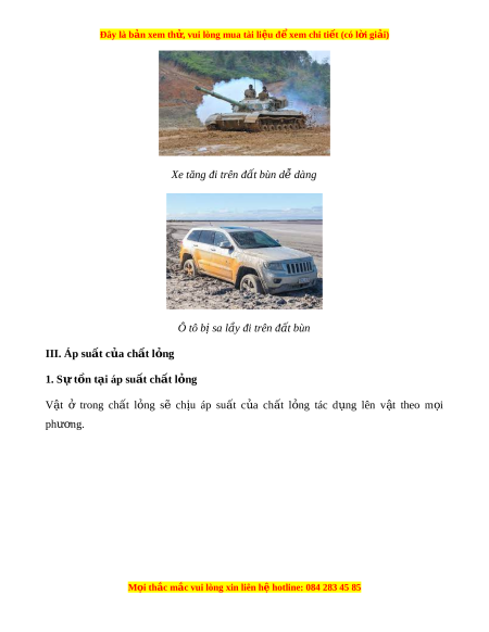 Đây là bản xem th , vu ử i lòng mua tài li u ệ đ xe ể m chi ti t (c ế ó l i ờ gi i ả ) Xe tăng đi trên đ t ấ bùn d dàng ễ Ô tô bị sa l y đi ầ trên đ t ấ bùn III. Áp su t ấ c a ch ủ t ấ l ng ỏ 1. Sự t n t ồ ại áp su t ấ ch t ấ l ng ỏ V t ậ ở trong ch t ấ l ng ỏ sẽ ch u ị áp su t ấ c a ủ ch t ấ l ng ỏ tác d ng ụ lên v t ậ theo m i ọ phư ng. ơ M i