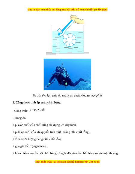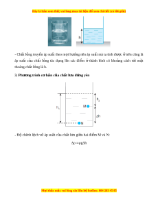 Đây là bản xem th , vu ử i lòng mua tài li u ệ đ xe ể m chi ti t (c ế ó l i ờ gi i ả ) Ngư i ờ thợ l n ch ặ u áp s ị u t ấ c a ủ ch t ấ l ng ỏ t m ừ i ọ phía 2. Công th c ứ tính áp su t ấ ch t ấ l ng ỏ - Công th c: ứ p p gh a - Trong đó: + p là áp su t ấ c a ch ủ t ấ l ng t ỏ ác d ng ụ lên đáy bình. + pa là áp su t ấ c a khí ủ quy n t ể rên m t ặ thoáng c a ủ ch t ấ l ng. ỏ + là kh i ố lư ng ợ riêng c a ủ ch t ấ l ng. ỏ + g là gia tốc tr ng t ọ rư ng. ờ + h là chi u ề cao c a c ủ t ộ ch t ấ l ng, cũng l ỏ à đ s ộ âu c a ch ủ t ấ l ng s ỏ o v i ớ m t ặ thoáng. M i