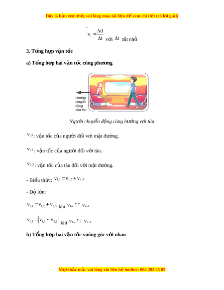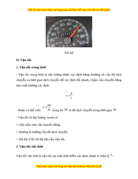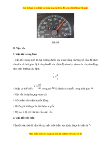 Đây là bản xem th , vu ử i lòng mua tài li u ệ đ xe ể m chi ti t (c ế ó l i ờ gi i ả ) Tốc kế II. V n t ậ c ố 1. V n t ậ c ố trung bình - V n ậ t c ố trung bình là đ i ạ lư ng ợ đư c ợ xác đ nh ị b ng ằ thư ng ơ số c a ủ độ d ch ị chuy n ể và th i ờ gian d ch ị chuy n ể để xác đ nh ị đ ộ nhanh, ch m ậ c a ủ chuy n ể đ ng ộ theo m t ộ hư ng ớ xác đ nh. ị d v t d v - Ho c ặ có th vi ể t ế : t trong đó d là đ d ộ ịch chuy n t ể rong th i ờ gian t - V n ậ tốc là đ i ạ lư ng ợ vect có: ơ + Gốc n m ằ trên v t ậ chuy n đ ể ng. ộ + Hư ng ớ là hư ng c ớ a ủ đ d ộ ch chuy ị n. ể + Độ dài tỉ l v ệ i ớ đ l ộ n ớ c a v ủ n ậ t c. ố 2. V n t ậ c ố t c t ứ h i ờ