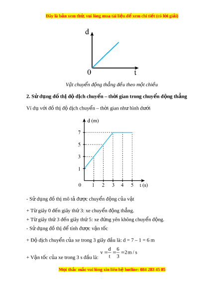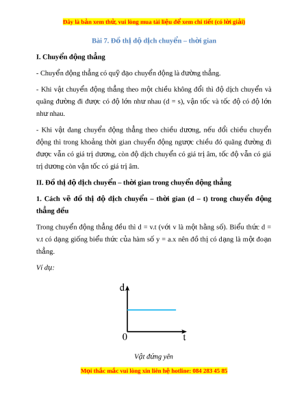 Đây là bản xem th , vu ử i lòng mua tài li u ệ đ xe ể m chi ti t (c ế ó l i ờ gi i ả ) Bài 7. Đồ th đ ị d ộ ch chuy ị n – t ể h i ờ gian I. Chuy n đ ể ng ộ th ng ẳ - Chuy n đ ể ng ộ th ng có qu ẳ đ ỹ o ạ chuy n đ ể ng l ộ à đư ng t ờ h ng. ẳ - Khi v t ậ chuy n ể đ ng ộ th ng ẳ theo m t ộ chi u ề không đ i ổ thì độ d ch ị chuy n ể và quãng đư ng ờ đi đư c ợ có độ l n ớ như nhau (d = s), v n ậ t c ố và t c ố độ có độ l n ớ nh nhau. ư - Khi v t ậ đang chuy n ể đ ng ộ th ng ẳ theo chi u ề dư ng, ơ n u ế đ i ổ chi u ề chuy n ể đ ng ộ thì trong kho ng ả th i ờ gian chuy n ể đ ng ộ ngư c ợ chi u ề đó quãng đư ng ờ đi đư c ợ v n ẫ có giá trị dư ng, ơ còn độ d ch ị chuy n ể có giá tr ịâm, t c ố đ ộ v n ẫ có giá trị dư ng còn v ơ n ậ tốc có giá tr âm ị . II. Đồ th đ ị ộ d ch ch ị uy n – t ể h i