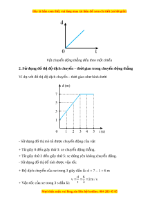 ờ gian trong chuy n đ ể ng t ộ h ng ẳ Ví d v ụ i ớ đồ th đ ị d ộ ch chuy ị n – t ể h i ờ gian nh hì ư nh dư i ớ - S d ử ng đ ụ ồ th m ị ô tả đư c chuy ợ n ể đ ng c ộ a v ủ t ậ + T gi ừ ây 0 đ n ế giây th 3: ứ xe chuy n đ ể ng t ộ h ng. ẳ + T gi ừ ây thứ 3 đ n gi ế ây th 5: ứ xe đ ng yên không chuy ứ n ể đ ng. ộ - S d ử ng đ ụ ồ th đ ị ể tính đư c ợ v n t ậ c ố + Độ dịch chuy n ể c a xe t ủ rong 3 giây đ u l ầ à: d = 7 – 1 = 6 m d 6 v 2 m / s + V n t ậ ốc c a ủ xe trong 3 s đ u l ầ à: t 3 M i