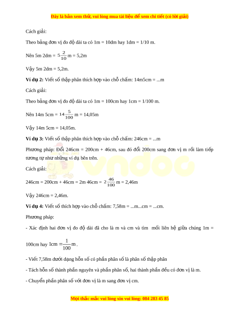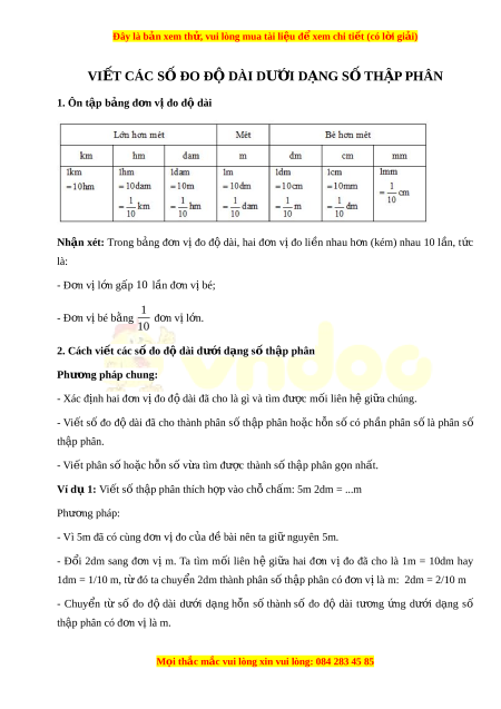 Đây là bản xem th , vu ử i lòng mua tài li u ệ đ xe ể m chi ti t ế (có l i ờ gi i ả ) VI T Ế CÁC SỐ ĐO Đ D Ộ ÀI DƯ I Ớ D N Ạ G S Ố TH P Ậ PHÂN 1. Ôn t p ậ b n ả g đ n ơ v ị đo đ ộ dài Nh n