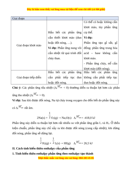 Đây là bản xem th , vu ử i lòng mua tài li u ệ đ xe ể m chi ti t (c ế ó l i ờ gi i ả ) Giai đo n ạ Có thể có ho c ặ không c n ầ kh i ơ mào, tùy ph n ả ng ứ Hầu h t ế các ph n ả ng ứ c t ụ h . ể cần thi t ế kh i ơ mào (đun Ví d : ụ ho c ặ đốt nóng, …). Ph n ả ng ứ t o ạ gỉ s t ắ , gỉ Giai đo n ạ kh i ơ mào Ví d : ụ Ph n ả ng ứ nung vôi đồng; ph n ả ng ứ trung hòa cần nhi t ệ từ quá trình đ t ố acid – base không c n ầ cháy than. kh i ơ mào. - Ph n ả ng ứ cháy, nổ c n ầ kh i ơ mào (đ t ố nóng). Hầu h t ế các ph n ả ng ứ Hầu h t ế các ph n ả ng ứ Giai đo n t ạ i p di ế n ễ cần ph i ả ti p ế t c ụ đun không c n ầ ph i ả ti p ế t c ụ ho c ặ đốt nóng. đun ho c đ ặ ốt nóng. 0 Chú ý: Các ph n ả ng ứ t a ỏ nhi t ệ ( H r 298 < 0) thư ng ờ di n ễ ra thu n ậ l i ợ h n ơ các ph n ả 0 ng t ứ hu nhiệt ( H r 298 > 0). Ví d : ụ Sau khi đư c ợ đ t ố nóng, Na t