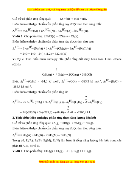 Đây là bản xem th , vu ử i lòng mua tài li u ệ đ xe ể m chi ti t (c ế ó l i ờ gi i ả ) Giả s có ử ph n ả ng t ứ ổng quát: aA + bB mM + nN. Bi n ế thiên enthalpy chu n c ẩ a ph ủ n ả ng này đ ứ ư c ợ tính theo công th c: ứ 0 H 0 H 0 H 0 H 0 H
