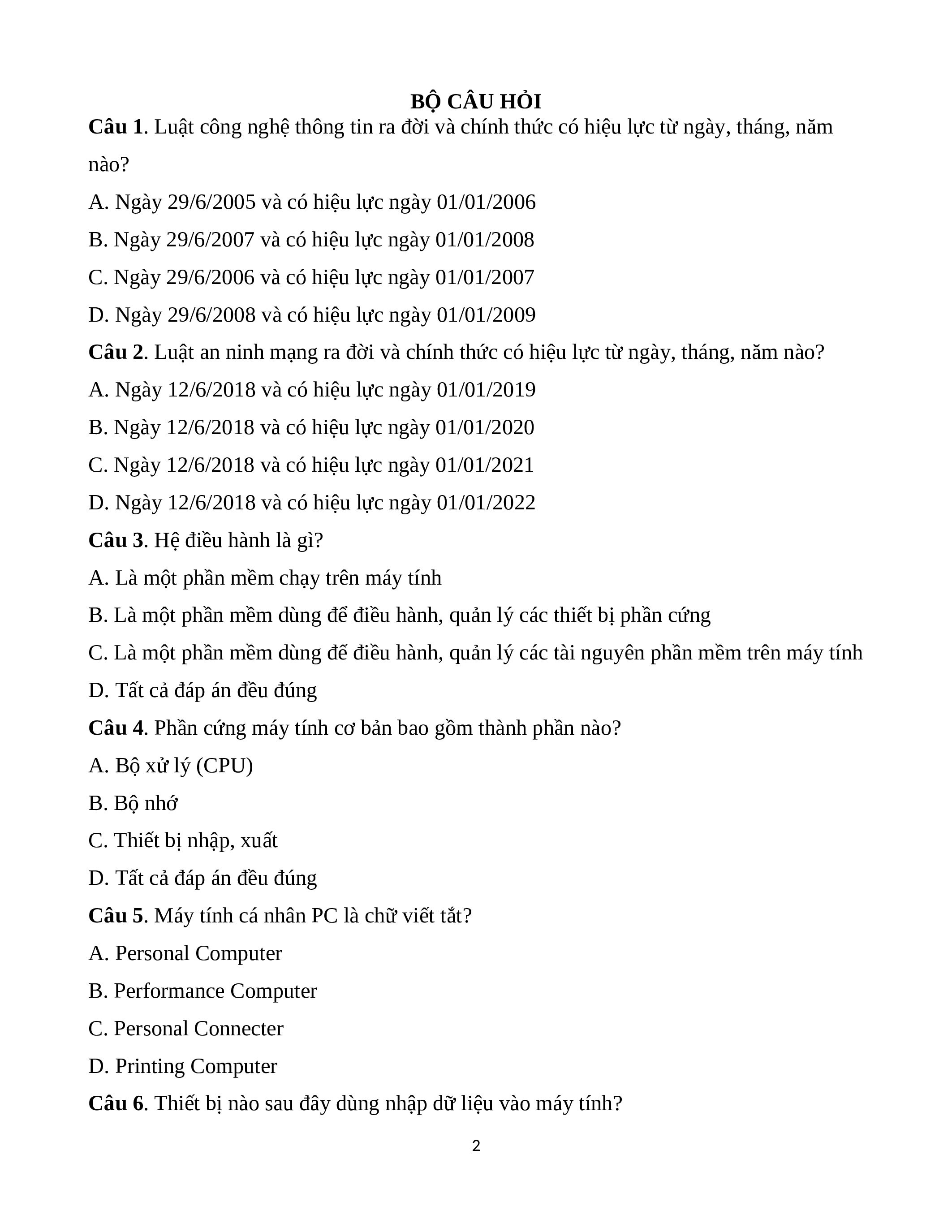 Câu 1. Luật công nghệ thông tin ra đời và chính thức có hiệu lực từ ngày, tháng, năm nào?
