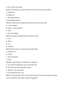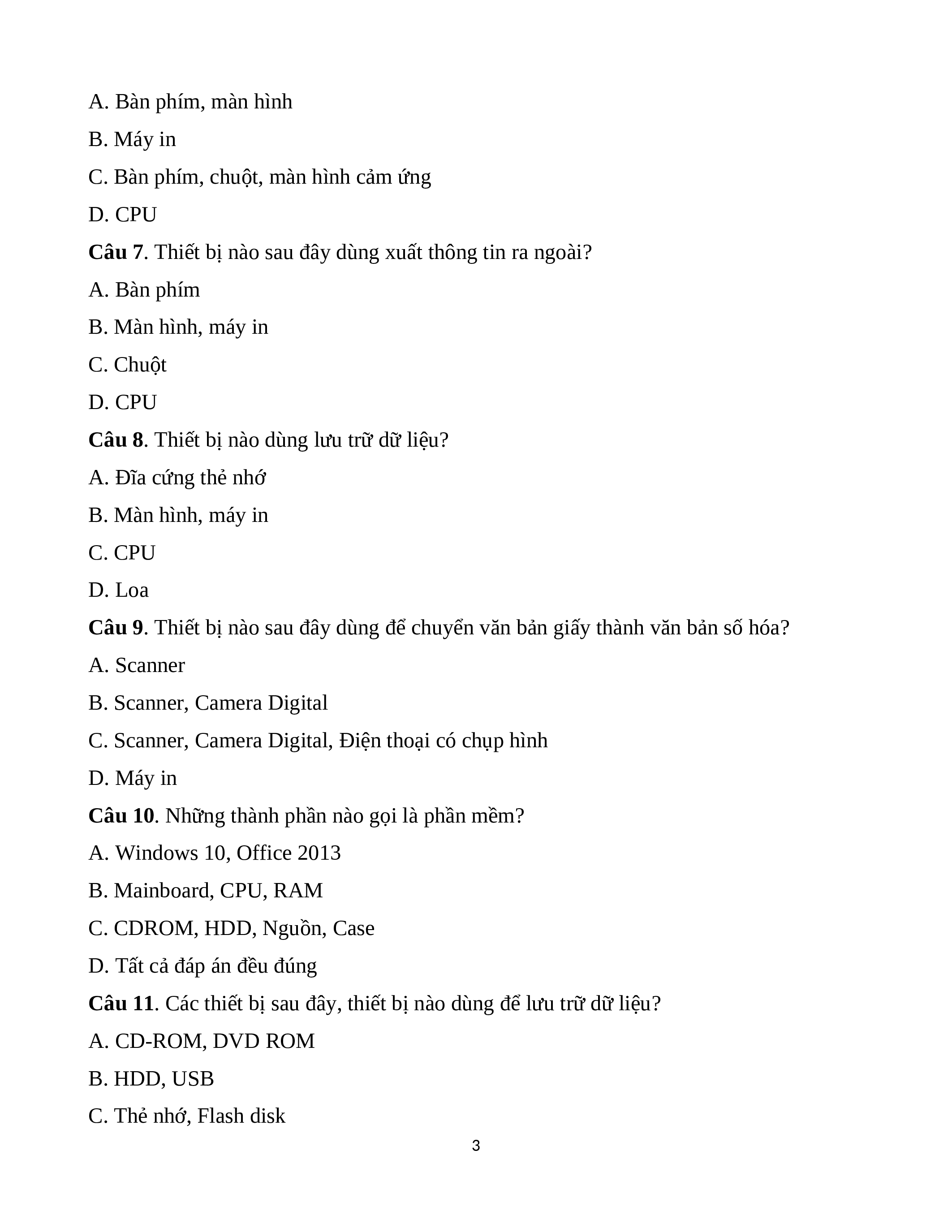 Câu 11. Các thiết bị sau đây, thiết bị nào dùng để lưu trữ dữ liệu? A. CD-ROM, DVD ROM B. HDD, USB C. Thẻ nhớ, Flash disk 3