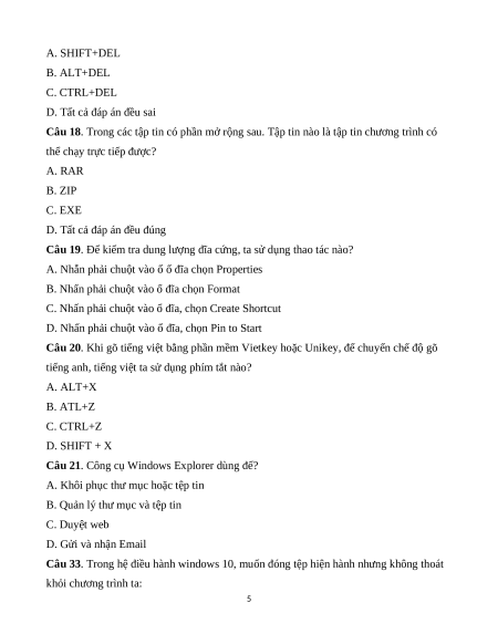 Câu 15. Phần mềm nào sau đây gọi là hệ điều hành? A. Windows 10 B. Unikey C. Microsoft Office D. Paint