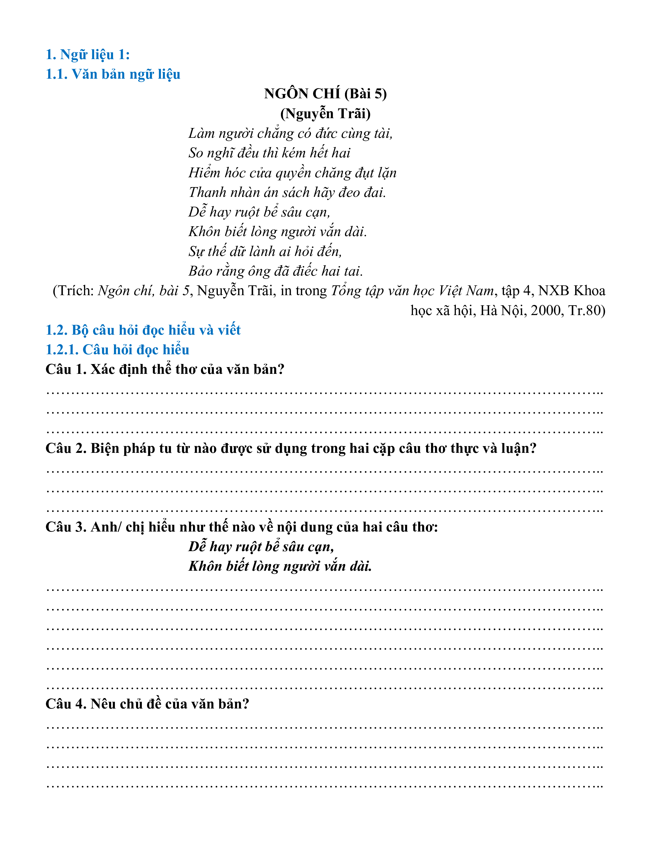 - Tailieugiaovien.com.vn giới thiệu Bộ 10 ngữ liệu ngoài sách giáo khoa lớp 10 phần Thơ, văn Nguyễn Trãi (dự kiến gồm trên 100 ngữ liệu) đầy đủ bộ câu hỏi Đọc hiểu và viết có hướng dẫn chi tiết giúp Giáo viên có thêm tài liệu ôn tập cho học sinh ôn thi Văn lớp 10.