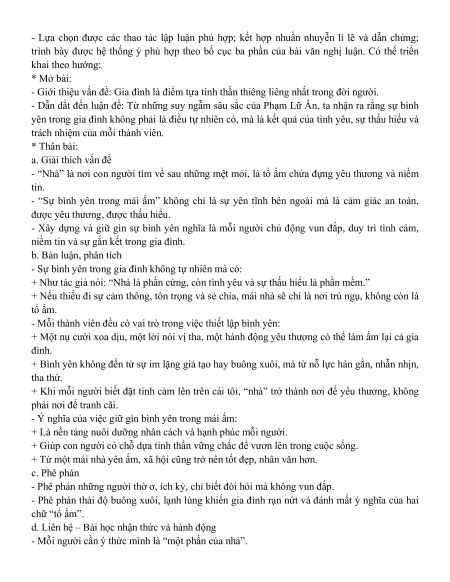 + Trình bày suy nghĩ về trách nhiệm của mỗi người trong việc giữ gìn và vun đắp sự bình yên trong gia đình. - Hệ thống ý 1. Giải thích vấn đề: