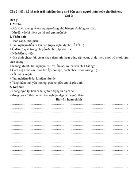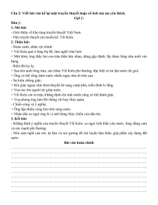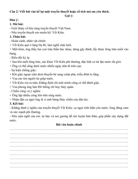 Câu 2: Viết bài văn kể lại một truyền thuyết hoặc cổ tích mà em yêu thích. Gợi ý: Dàn ý: 1. Mở bài: