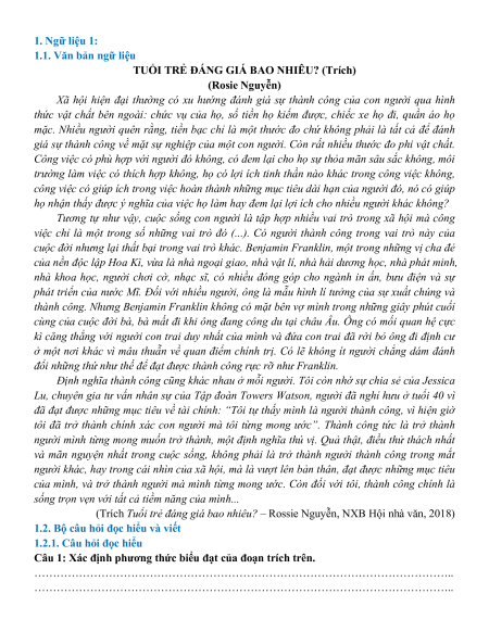 1.1. Văn bản ngữ liệuTUỔITRẺĐÁNGGIÁBAONHIÊU?(Trích) (Rosie Nguyễn)