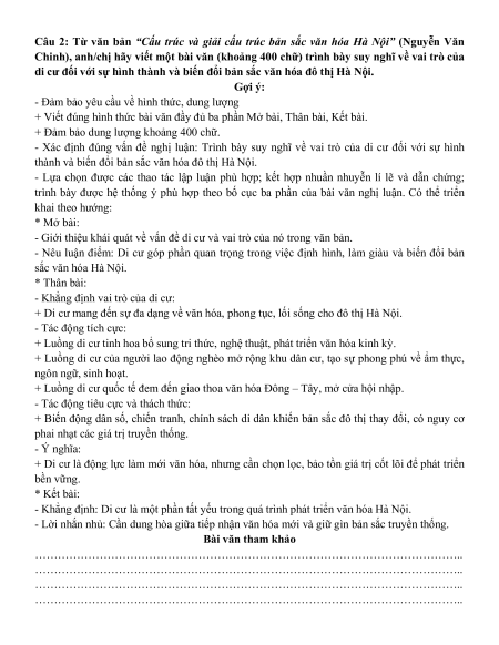 + Thể hiện rõ suy nghĩ của anh/chị về tác động của các luồng di cư đến đời sống văn hóa đô thị Hà Nội.